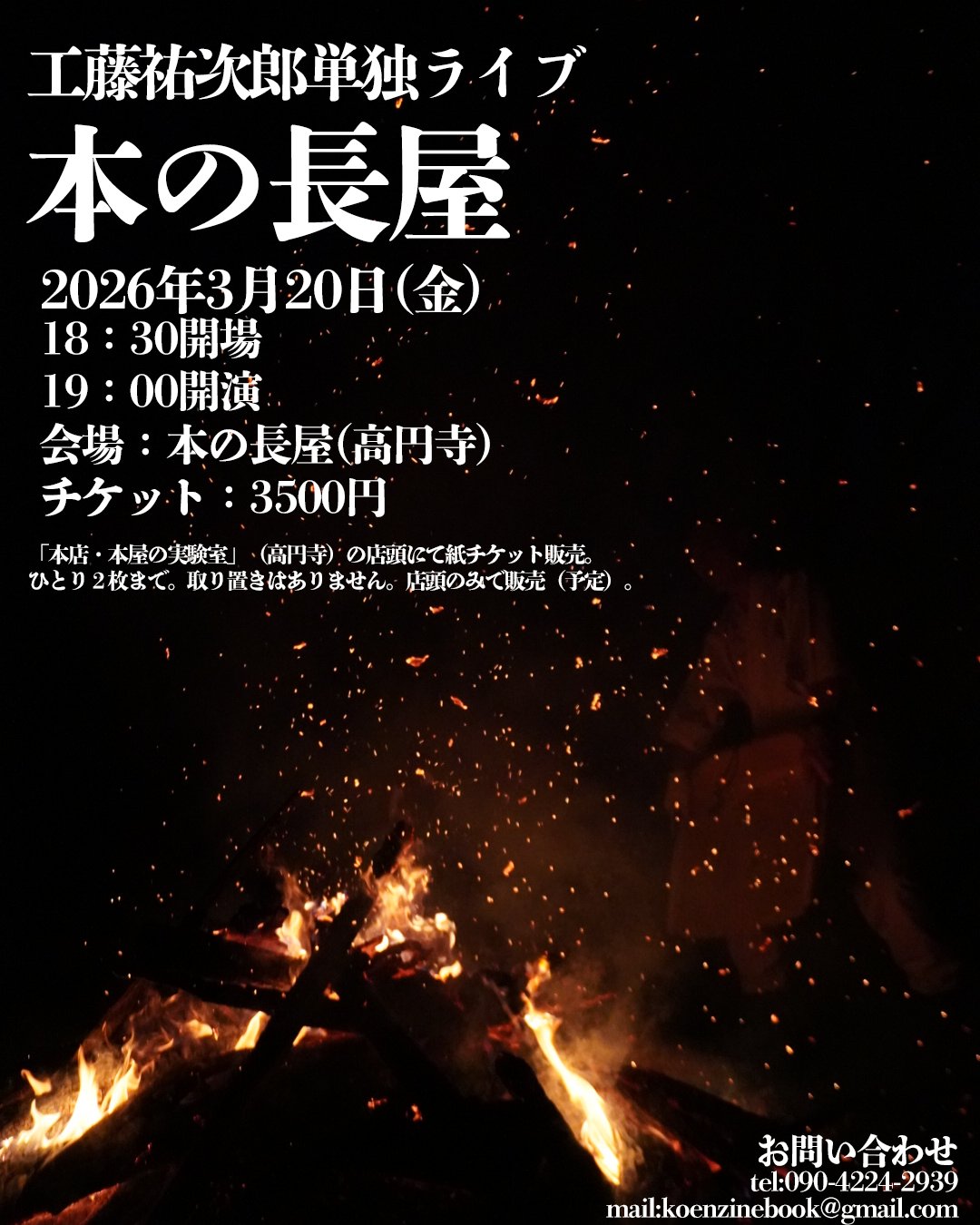 3月20日(金)高円寺 本の長屋にて、工藤祐次郎 単独ライブを開催します。